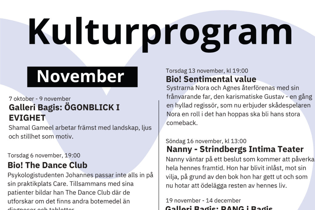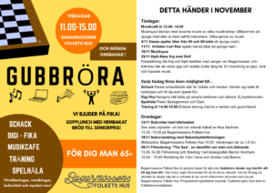 Vi rullar vidare med vårt projekt Gubbröra! Alla aktiviteter är gratis och vi bjuder på fika. Varje tisdag kan du köpa soppa med hembakt bröd för 30 kr (60 kr för alla under 65 år). Här är programmet för november.